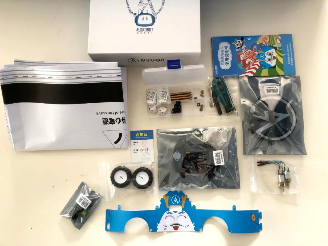 打开箱子,里面分别配有寻线地图、各种零件和传感器、皮肤贴纸、彩色说明书、轮子与电机等,每个零件都是独立包装,很有质感,不会伤害到小朋友。