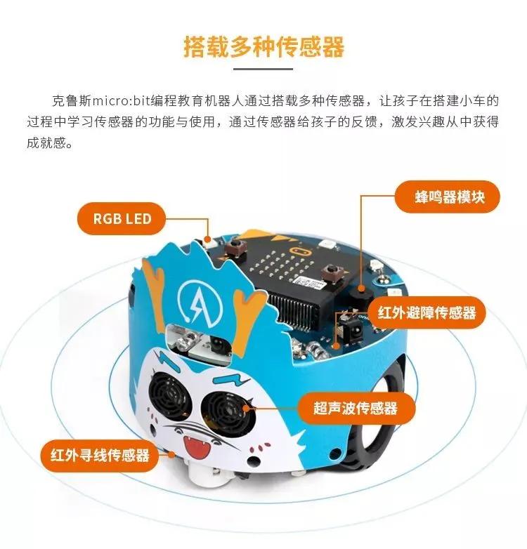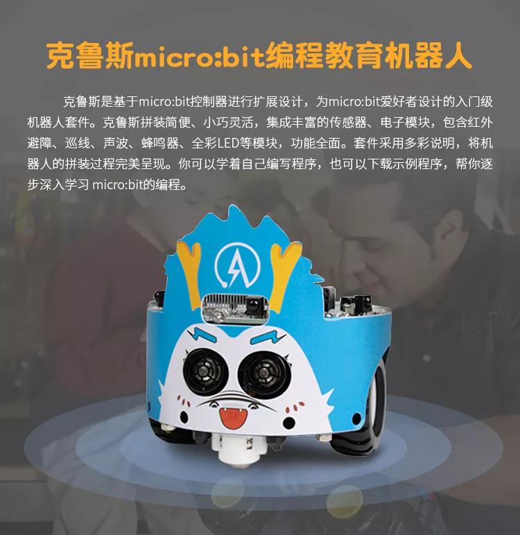 想要让克鲁斯有更多玩法需要配micro:bit主板(需另外购买),将micro:bit安装到克鲁斯上配合一些周边配件使用就可以实现各种丰富的功能了! 成果如下: