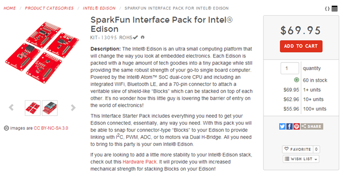 This Interface Starter Pack includes everything you need to get your Edison connected, essentially, any way you need. With this pack you will be able to snap four connector-type “Blocks” to your Edison to provide linking with I2C, PWM, ADC, or to motors via Dual H-Bridge. All you need to bring to this party is your own Intel® Edison.