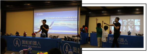 党老师的演讲和拓展训练调动了小营员们的活跃度,在接下来的STEAM《机器人装甲军团大集结》的环节中,奥松机器人创始人于老师的机器人科普则是让孩子们大开眼界!