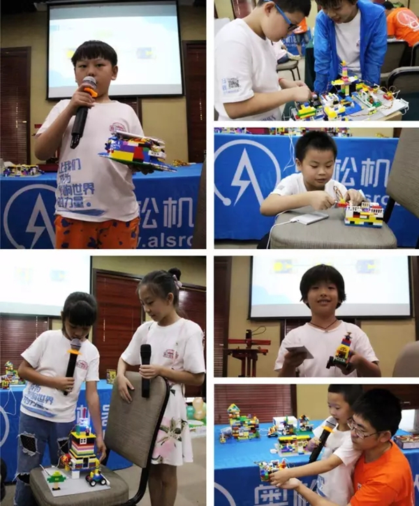 营员们拿着自己设计的作品,向所有人展示自己作品的初衷和构想:设计门灯听到声音会点亮的小房子,迎接下班的妈妈回家;可自动躲避障碍的小车帮助盲人走路,孩子们的创造能力,真是超过我们的想象...