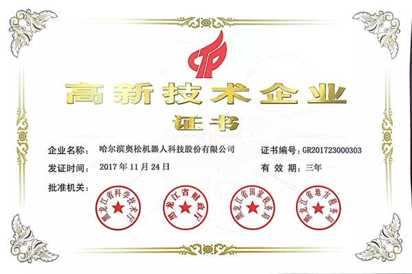 - 恭喜奥松机器人荣获“国家高新技术企业”认定,希望奥松砥砺前行!