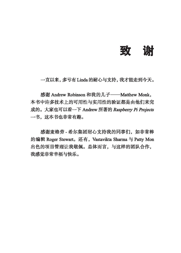 感谢Andrew Robinson 和我的儿子― Matthew Monk , 本书中许多技术上的可用性与实用性的验证都是由他们来完成的。大家也可以看一下Andrew 所著的Raspberry Pi projects一书,这本书也非常有趣。
