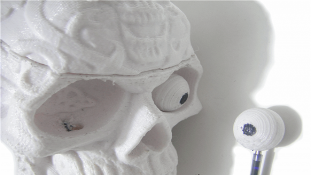 为了制作这样一个诡异的万圣节礼物,笔者想起了早先在Thingiverse下载的骷髅模型。打算以它为蓝本,进行一番Arduino电控改造。首先,把模型文件放入MakerWare中,配置为低精度打印,等待Gcode生成完毕,存入SD卡,开始打印。