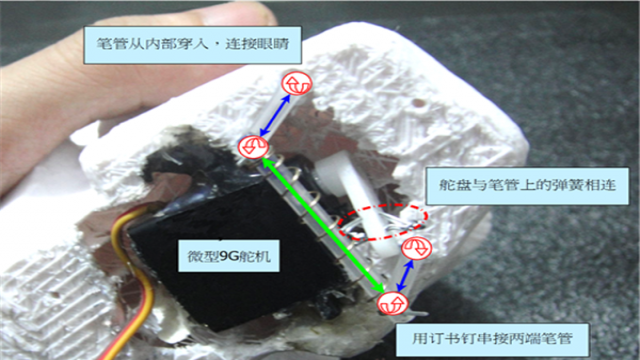 两根转轴的同步横轴也是用的笔芯,连接销用的是订书钉。这样,这根横轴摆动的同时,就会间接带动上面的两个眼球转动。试图用舵机的摇臂直接与同步横轴相连时,笔者犯了难。因为舵臂转动受限,转角稍有不慎,舵机动作就会卡住,容易损害舵机。看着桌面上多余的两个弹簧,笔者当时灵机一动。把这其中一个拆出的弹簧拿来,套在同步横轴上,摇臂连接到弹簧,间接带动同步横轴。舵机转动过量时,不会卡死,而是压缩弹簧。