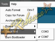 在Arduino上面的菜单上选择“Tools>Serial port>COM 7”,与刚才安装的COM port一致,保持COM 7为勾选状态。
