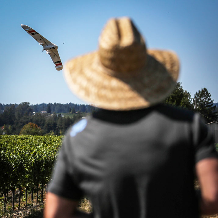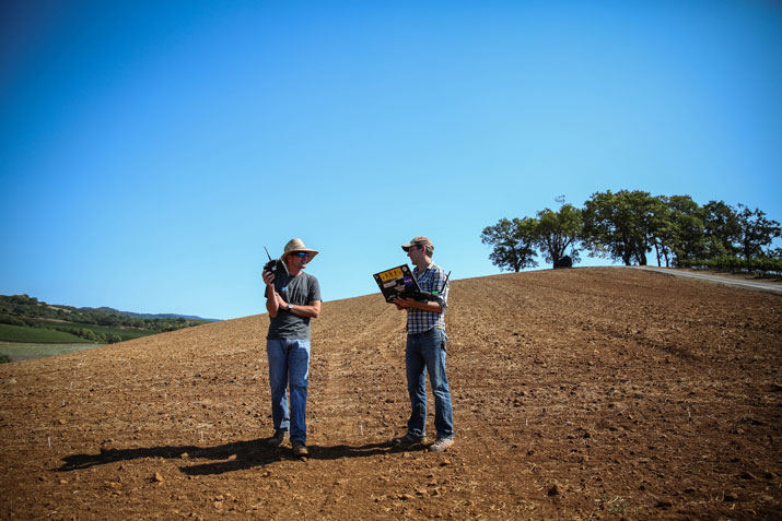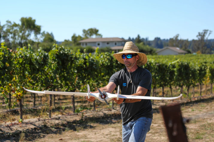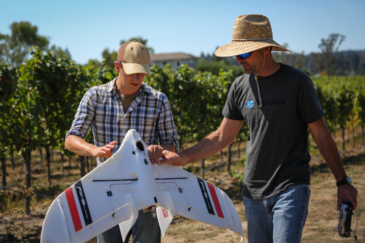 Cherbini正观察着飞行器。这架飞行器由3D Robotics生产,正执行全自主飞行任务中。葡萄园的收获时节很短,用类似这样航拍的技术能为农场提供不断跟进和准确的实况图像支持。图片版权:Sally French, 3D Robotics