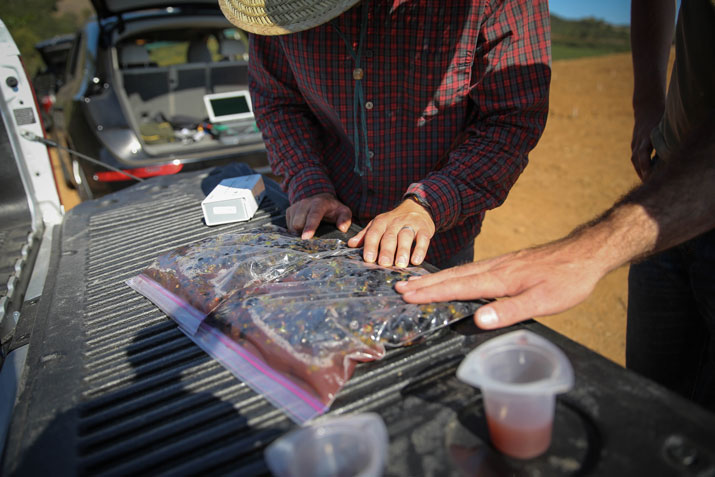 葡萄农Ryan Kunde准备榨取塑料袋中的葡萄。他能知道哪些葡萄能被收割下来,全靠3D Robotics无人机的航拍图像。图片版权:Sally French, 3D Robotics