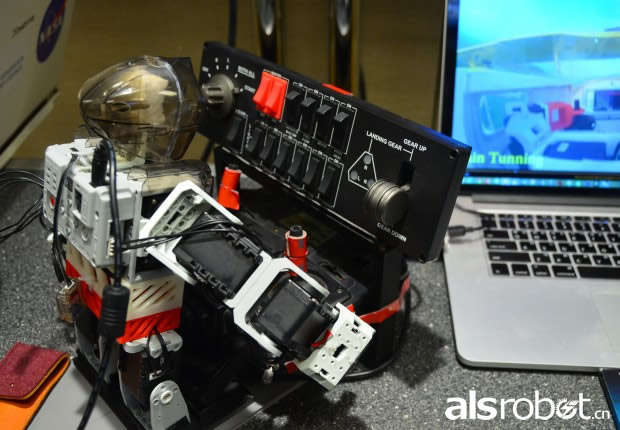 图中的机器人是一款非常小而且低价的人形机器人。经过轻微修改后以适应这款缩放后的飞行模拟器驾驶舱。PIBOT能够识别并使用这款为人类所设计的正常飞行器驾驶舱中的按钮、开关等:
