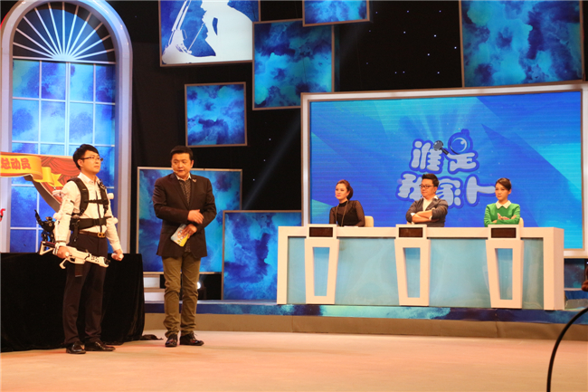 于欣龙向主持人鸥哥和三位明星嘉宾展示外骨骼机械装甲操控器