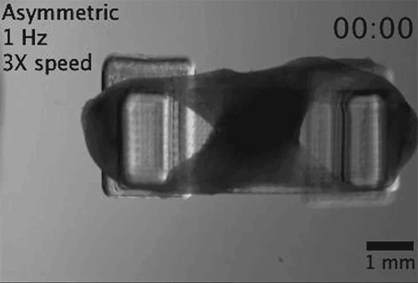 在设计上,3D打印的水凝胶充当生物机器人的脊骨。这条脊骨拥有足够的坚固度,赋予生物机器人结构,同时又能像关节一样弯曲。两个锚柱负责将肌肉条固定在脊骨上,就像腱将肌肉依附在骨骼上一样。此外,锚柱还充当生物机器人的脚。它的速度可以通过调节电脉冲的频率进行控制。