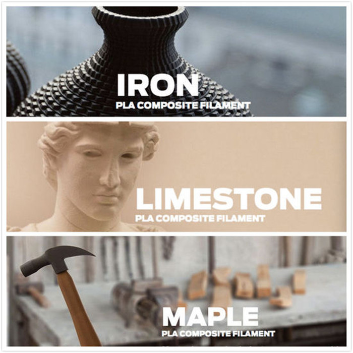 首先他们在今年 CES 上展示了由三种新研发的 3D 打印纤维做出的样品。它们有望在 2015 年后期面市,可分别模拟铁、石灰岩和槭木的外观、质感和部分特性。这三种纤维本质上还是与之前相同的 PLA 塑料,但是由于添加了复合材料,呈现出一些其他材料的特质。