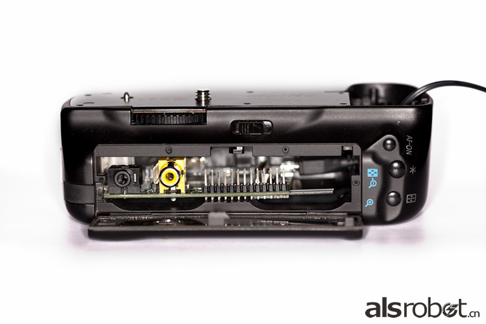 他首先买必备的Raspberry Pi(B版,有Ethernet网络接口),以及DC-DC电压转换器、USB线和802.11n WiFi Dongle装置。由于相机本身没有多余空间让他塞入Raspberry Pi电脑,因此他选择朝外接电池盒下手,从图中可看出他选了一个副厂M诶可品牌的外接把手开刀。接着完全发挥土炮精神,将Raspberry Pi结合在外接电池盒之中,由于B版Raspberry Pi本身配置了2个USB孔、Ethernet网络孔,以及Audio输出、RCA输出,David Hunt也挖出位置让这些输出入端子能露出来。原先的电池位置因为摆了电脑,因此电池室换了个方向,从右侧安装一颗7.2V 1800 mAh锂电池、再透过7-12V to 5V DC-DC电压转换器提供电脑所需的电力。这台电脑安装的是Linux系统。
