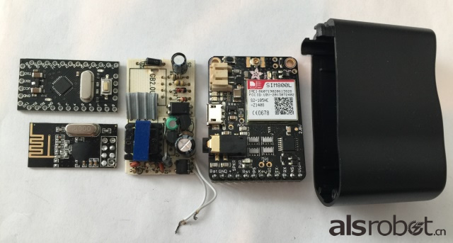 机身内装有 Arduino Pro mini、RF 模组、移动电话模组以及电源模组。