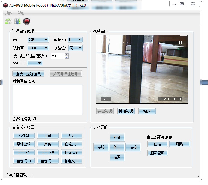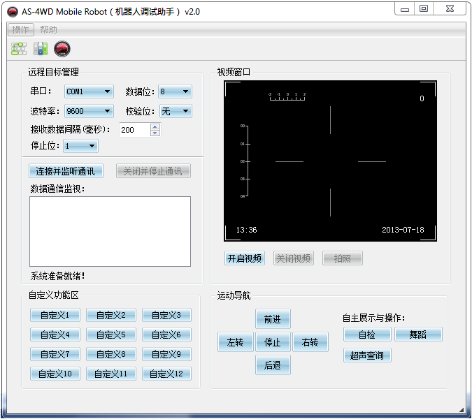 机器人调试助手v2.0串口软件除了保持第一版的操控小车的前进、后退、左转、右转、停止等运动导航快捷键,自检、舞蹈、超声查询等展示快捷键外还增加了12个自定义区域供给我们扩展使用,你可以自由发挥!