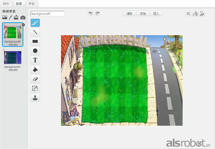 在“新建背景”中选择“从本地上传背景”,在“ALSRobotBase”文件夹中选择background0.jpg作为白天背景,单击“确定”,用“选择”工具进行调整,使其平铺于舞台。然后在“造型”中添加background1.jpg作为夜间背景,背景制作完毕后如图9所示。