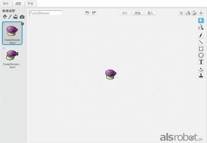 3)添加大喷菇角色:在新建角色中选择“从本地上传角色”,在“ALSRobotBase”文件夹中选择“FumeShroom.png”,点击确定,用“选择”工具进行调整至大小适中。然后在造型中添加“FumeShroomAttack.png”作为攻击时的造型。(见图13)。