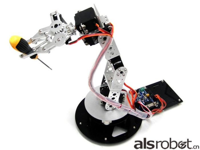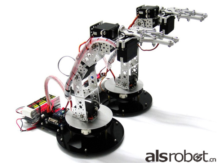 以前,机械手臂因其功能针对性强和高额的售价,使人们望而却步。现在你不必担心这个问题了,奥松AS-6D0F铝合金机械臂套件,可以实现你的机器人梦想。既然是机械手臂,你肯定会联想到我 们人类的手臂,除了肩、肘、腕基本关节,再加上多个手指关节,才会使手臂如此灵活,那么我们将复杂问题简单化,用6个伺服舵机以巧妙的结构设计,结合它的 控制系统,就能展示出控制6自由度机械臂的工作原理,因此可作为教学演示平台。