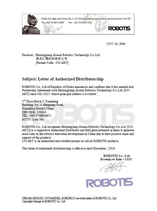 韩国Robotis官方对奥松机器人企业资质、行业地位、业务能力、技术条件以及售后服务等多方面经过数月考核,通过认证,并授予奥松机器人(ALSROBOT)成为韩国Robotis官方授权的中国大陆地区代理经销商。购买韩国Robotis原装正版产品请认准官方授权!