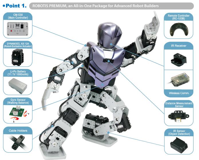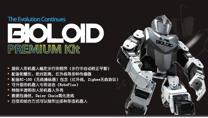 只要你想到,就能做的出。Bioloid机器人完整套件组,适合给中小学和高校及机器人爱好者等学习使用,创造一个完全新的运动,全新理解基本概念的一个机器人,能使用户创造更高层次的机器人。