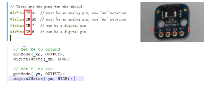 2、从易用角度来说,Adafruit 提供了产品的库文件(包含例子程序),但是在程序中引脚定义不明确,最后查看了库函数才完成了接线。如图:程序中定义是:YP XM YM XP与接口板的标注不同,但是在库文件中有说明,这样一来接线上就会比较麻烦,所以在提供例程的时候,定义的名称与产品引脚名称应该保持一致。