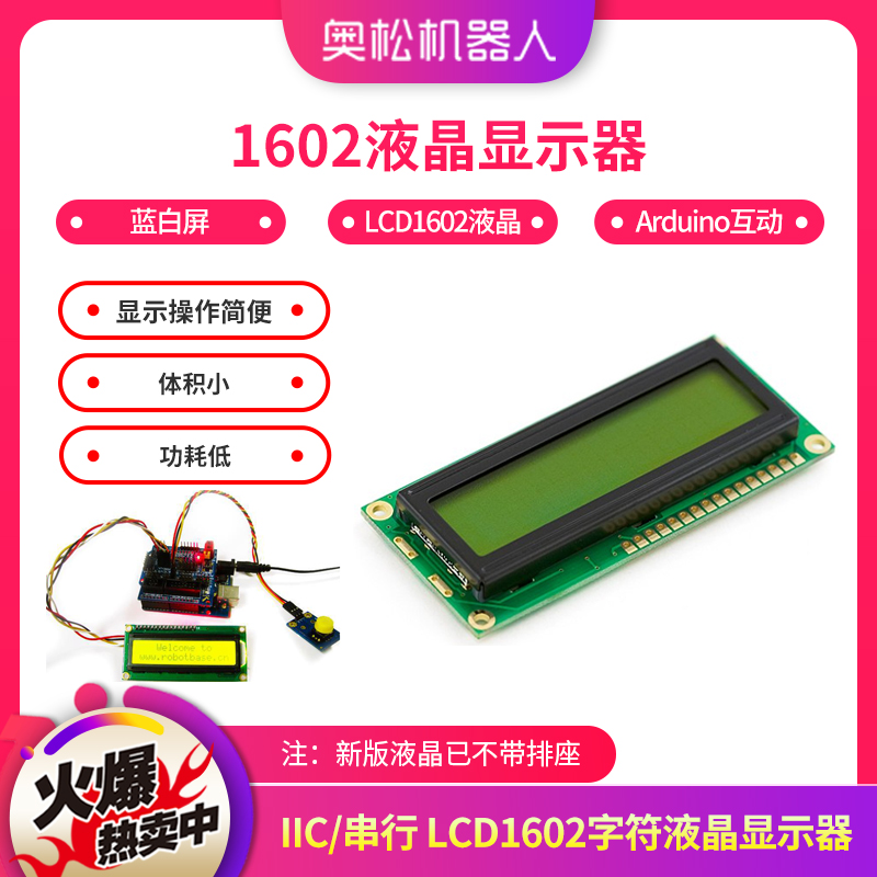 液晶显示器,英文全称为Liquid Crystal Display,简称LCD。其是以电流刺激液晶分子产生点、线、面并配合背部灯管构成的画面。大家通常将各种液晶显示器直接简称液晶。本1602液晶,每行显示16个字符,共显示2行,并行接口,全新产品。其体积小、功耗低、显示操作简便,不但是轮式机器人产品,还是Arduino互动界面直接设备.......注:新版液晶已不带排座,如需要排座或者排针请联系客服。