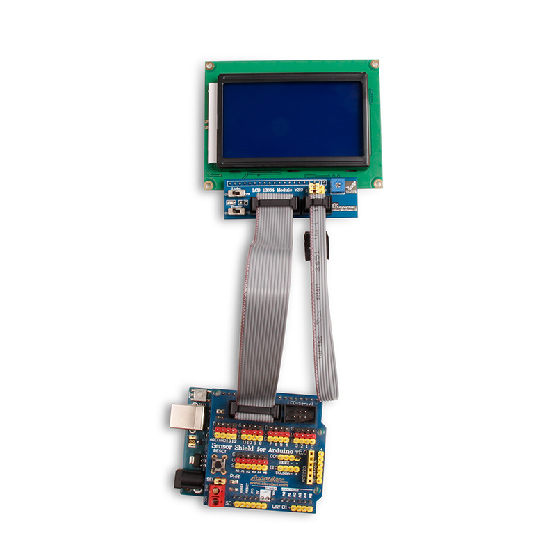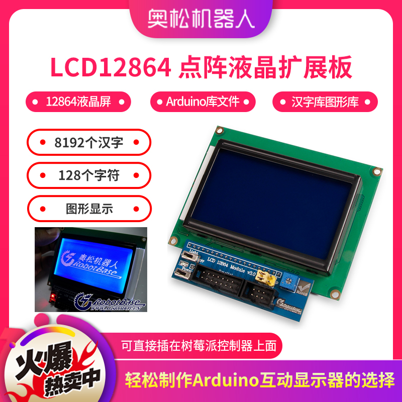 奥松机器人新推出的12864液晶板采用的是带汉字库图形点阵液晶显示模块,具有串行和并行接口,背光控制开关(串行与并行模式均可使用),对比度调节旋钮,板上集成IDC6插座和IDC14插座,可通过套件中附送的专用连接线与Arduino传感器扩展板连接,无需再买相关转接板,通过我们提供的例子程序,您可以用Arduino控制器做控制完成显示8192个中文汉字(16X16点阵)、128个字符(8X16点阵)和图形显示(128X64点阵)功能,轻松制作Arduino互动显示器的选择。