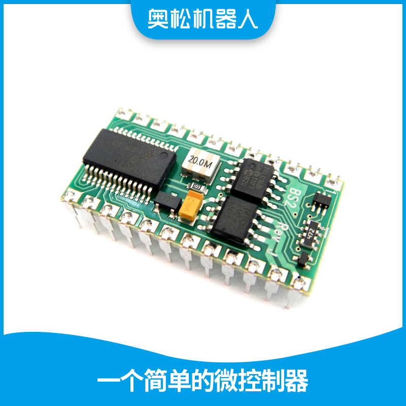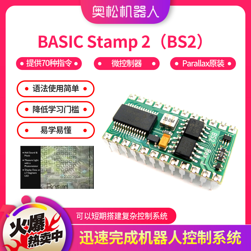 BASIC Stamp 2(BS2)是一个简单的微控制器,它具有记忆体(EEPROM)可以储存使用者所开发的程序;并且具有输出输入装置(I/O),这些输出输入的装置可以利用PBASIC语法,很容易去规划及使用,如完成一些电机控制,传感器反馈等等。 PBASIC的语法使用起来非常简单,使用者不需要去了解微控制器的硬体架构或电路设计,利用它所提供的70种指令,来完成你的机器人控制。它在欧美很流行可以降低使用者学习门槛,可以短期搭建复杂控制系统,与现有的低级单片机相比更易学易懂。BASICStamp 2可以更进阶的使用设计, 可以利用其他的各种模组或传感器,如步进电机驱动器,蓝牙无线通讯模组,无线网络模组、超声波传感器、红外传感器等等,它会迅速完成你需要的机器人控制系统或是机电整合系统。