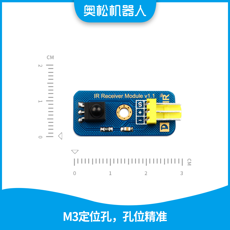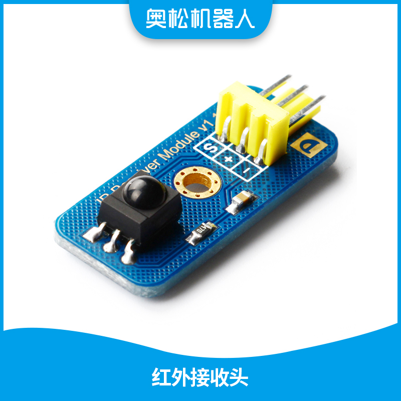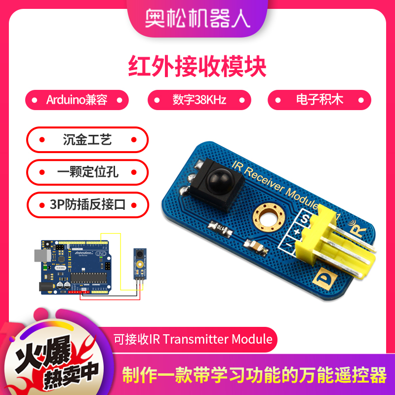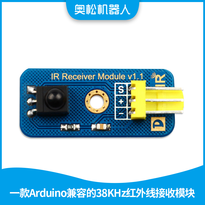 此款红外接收模块是奥松机器人推出的一款Arduino兼容的红外线发射传感器,可接收IR Transmitter Module,通过对Arduino进行编程发射出38KHz调制信号,从而实现红外无线通讯。此款模块与旧版相比沿用美观的沉金工艺和一颗定位孔设计风格,让模块保证功能的前提下制作的足够美观,模块数据接口上由原来的普通排针更改为标准传感器3P防插反接口,防止非专业人士使用时造成错误的操作,同样沿用将传感器名称以英文标示在PCB上,较旧版也更人性化的在接口两侧放置两个标识,标识“D”代表模块为数字接口“S”代表引脚输入或输出为数字信号,另一个标识以图型方式传达模块功能,方便非专业人士快速了解模块功能。