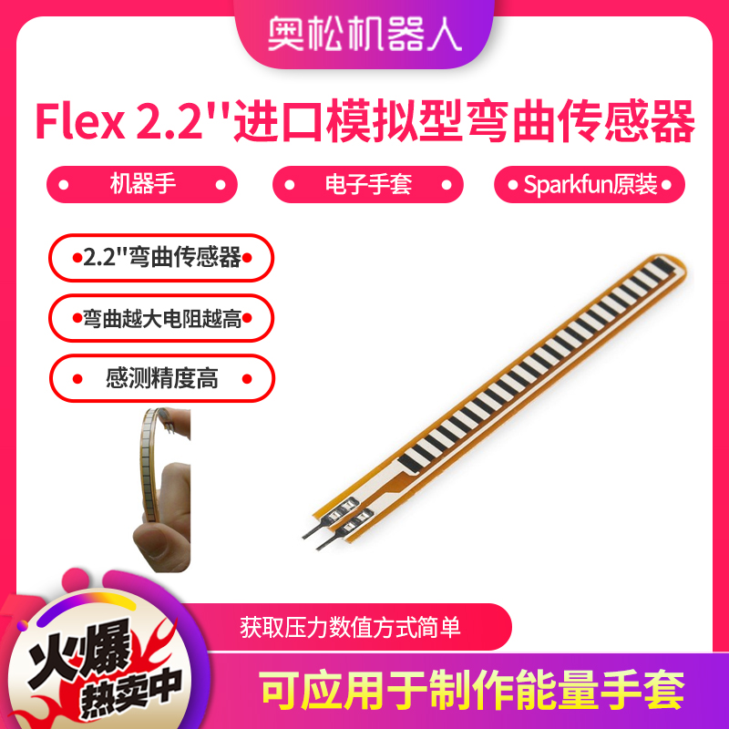 新弯曲传感器(Flex Sensor By Spectra Symbol)是一个简单测量弯曲强度的传感器,并借着封装,可以将它固定在被测曲面上,配合模拟输出,方便将弯曲信息采集并处理。总长度80mm测量长度却长达60mm,配合带有AD转换的控制器特别适合做手指弯曲度检测、机器人、医疗器械、乐器等产品。产品说明书:http://www.sparkfun.com/datasheets/Sensors/Flex/flex22.pdf