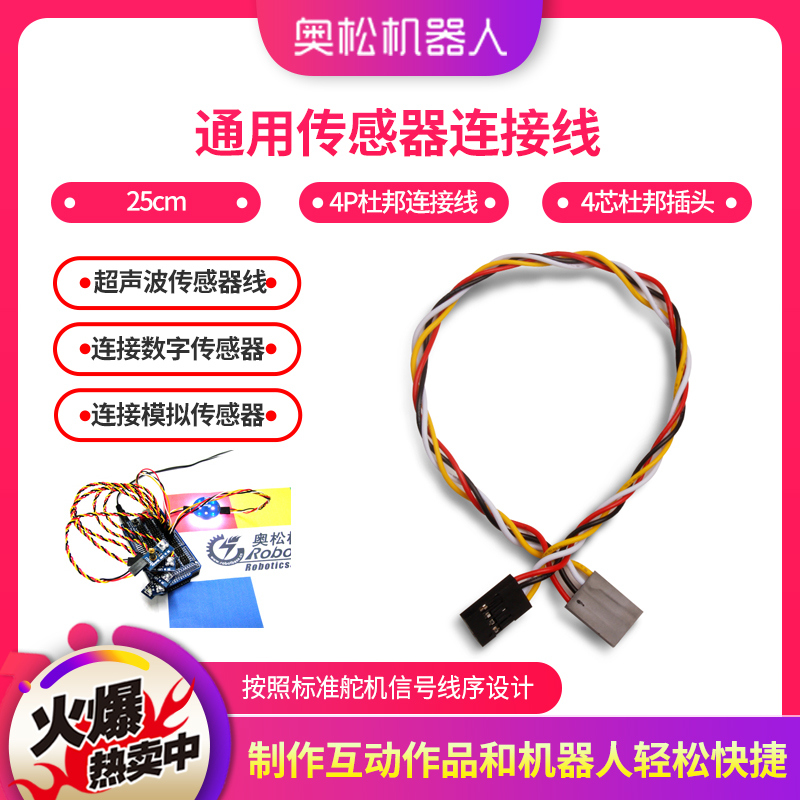 通用4P传感器连接线,长度25cm,4芯杜邦插头,按照标准舵机信号线序设计。适合连接数字传感器、模拟传感器到Arduino传感器扩展板上,制作互动作品和机器人轻松快捷。