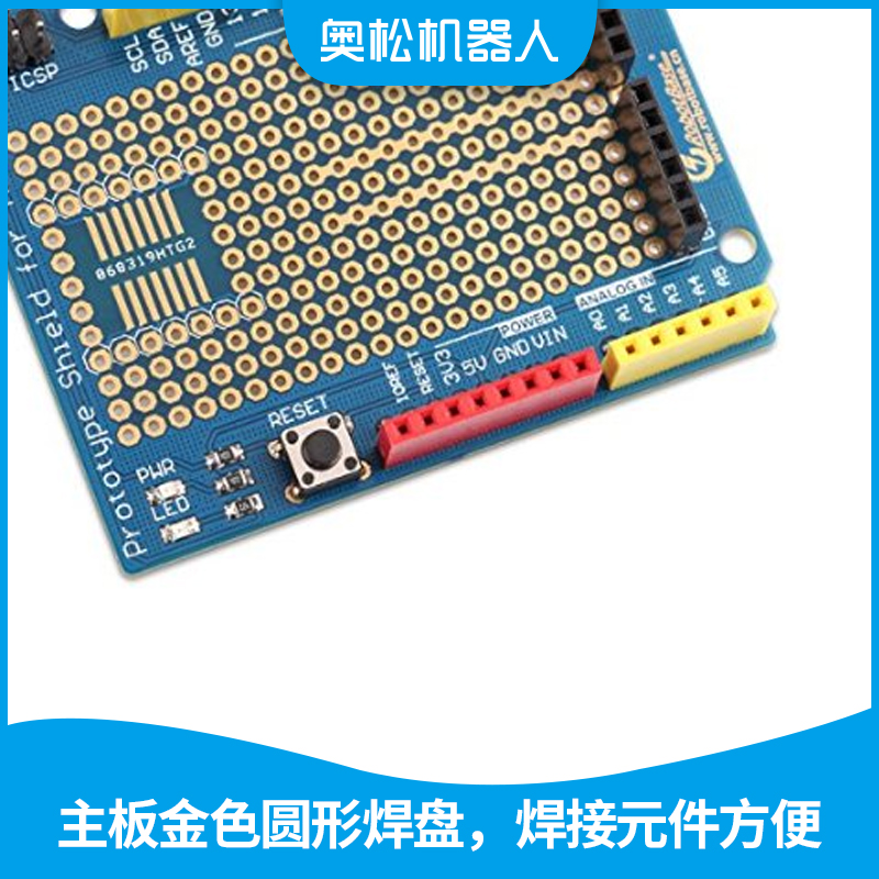 2014年新推出的Arduino Prototype Shield v6.0原型扩展板采用PCB沉金工艺加工,主板金色圆形焊盘,焊接元件方便;SOP14贴片元件封装,使Arduino电子爱好者更加得心应手,不会被直插元件所束缚;此板不仅可以无缝插接到Arduino Duemilanove控制器上,直接将元件焊接到上面,完成各种原型电路,还可以粘贴Mini面包板,通过7彩跳线完成各种电路实验,板子集成电源指示灯和状态指示灯,以及复位按键,轻松学习Arduino Duemilanove控制器首选原型扩展板。
