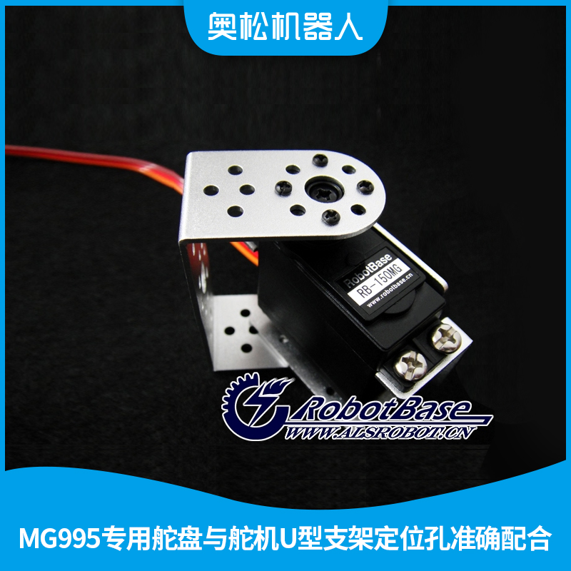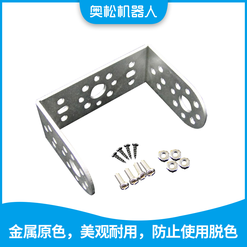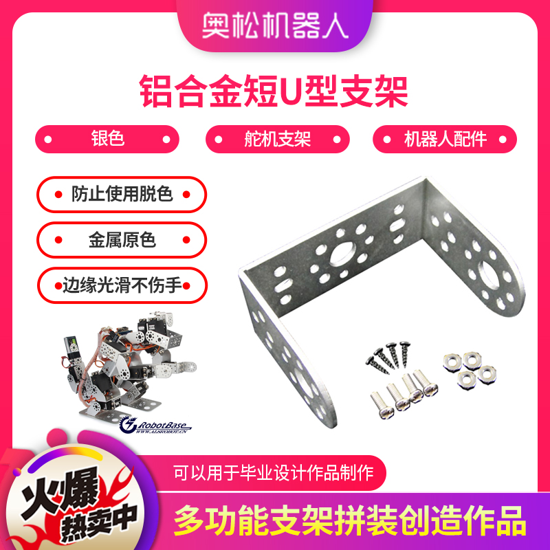 "U" Multi-Purpose Servo Bracket 铝合金舵机U型支架可以与Aluminum Servo Bracket舵机支架、杯士轴承组成机器人旋转关节,多自由度旋转云台、多自由度机械手臂、仿生机器人、双足竞步机器人、类人型机器人。零件表面特殊有色氧化工艺处理,边缘光滑不伤手,保证金属原色,美观耐用,防止长时间使用脱色。 U型舵机支架,可以用于毕业设计作品制作、全国“挑战杯”科技学术作品竞赛、CCTV机器人比赛、Robocup机器人公开赛推荐零件。