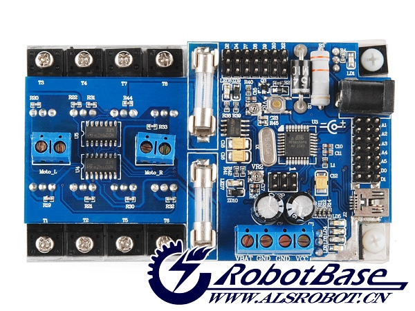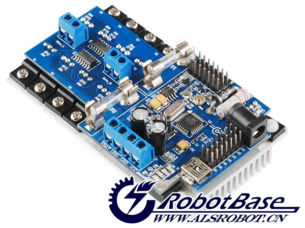 基于Arduino双路大功率电机驱动板的核心采用AVR系列ATMEGA168微控制器,它预装Arduino的引导加载程序和无线遥控代码。主板采用FT232通信芯片和mini-USB接口,代码可以很容易地再次下载更改。板子上的所有接口标注字符清晰,方便连接。 电机控制器是由双H桥15A FET组成,并有熔断器做保护。熔断丝是由单片机检测,由LED板来指示。螺丝端子密集的,明显的标志着左和右。所有的场效应管固定在铝散热器和热带电隔离。