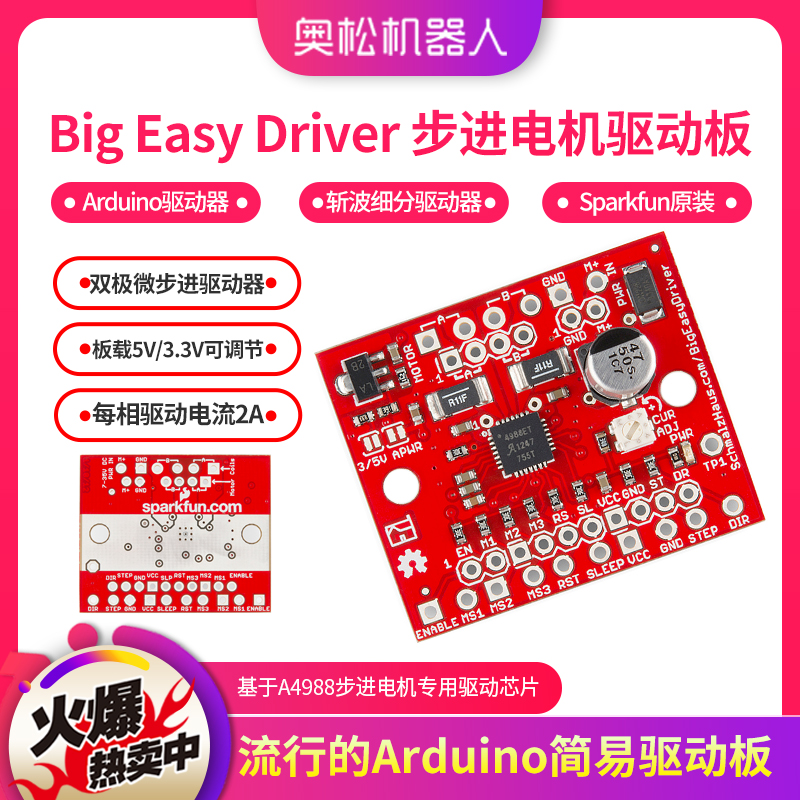 通知: 哈尔滨奥松机器人科技有限公司为sparkfun官方中国区域代理,此款产品由于数量有限,拍下时请咨询客服是否有库存。 2013年哈尔滨奥松机器人科技有限公司正式成为美国电子开源硬件巨头公司Sparkfun中国区域代理商。Big Easy Driver步进电机驱动器为全新Sparkfun原装进口产品,此款步进电机驱动板基于A4988步进电机专用驱动芯片,可以驱动高达每相2A的双极步进电机,它是一个斩波细分驱动器,默认为16微步模式,可以实现35V的峰值电压并且板载5V/3.3V可调节选择端。