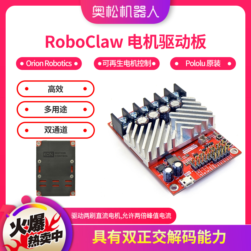 通知:奥松机器人科技有限公司于2013年正式成为美国Pololu官方授权中国区域代理商,此款产品由于数量有限,拍下时请咨询客服是否有库存。 这款来自Orion Robotics(以前叫Basic Micro)的RoboClaw是一种高效、多用途、双通道的同步可再生电机控制器。随着工作模式的不同,在6-34V电压作用下,它能够驱动两刷直流电机在30A电流下连续运转,允许两倍的峰值电流流过。 RoboClaw的特点是具有双正交解码能力。内建的PID程序能够实现闭环控制、速度保持。甚至是负载变化、编码器数值与速度都可以通过外部微控制器直接从RoboClaw读取。在闭环位置控制的情况下,得到模拟量反馈也不是问题。 RoboClaw支持几种控制模式:适合嵌入式系统或PC的TTL串行通讯,玩具模型的ESC遥控控制、模拟电位计或模拟操作杆。