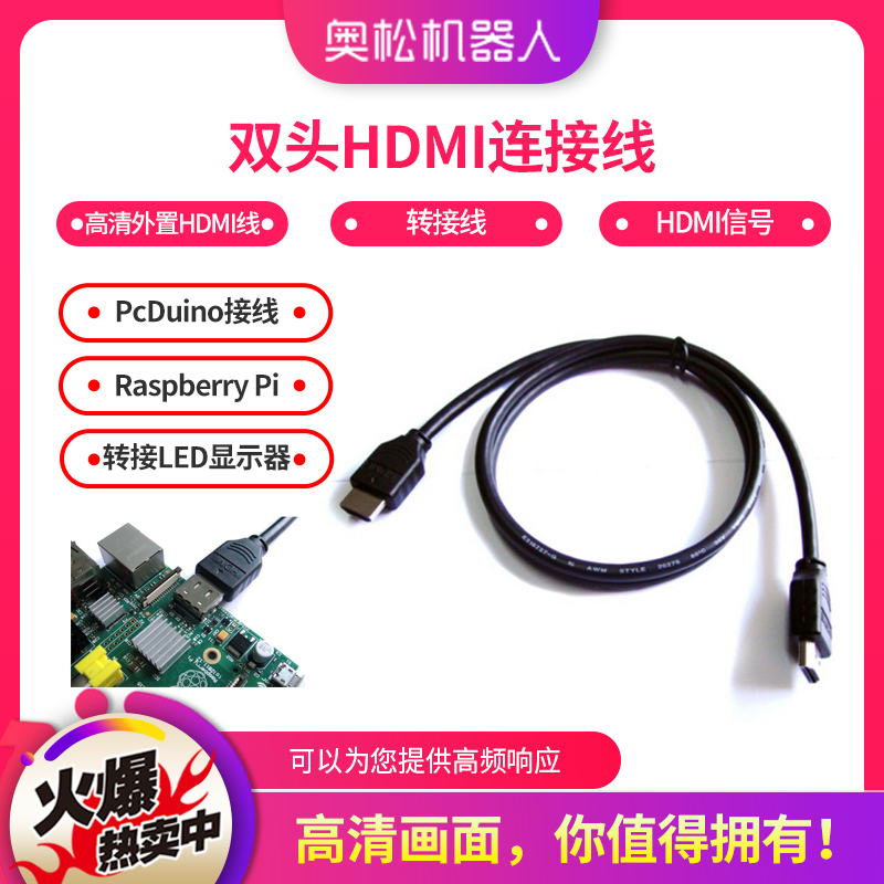 哈尔滨奥松机器人科技有限公司全新推出一款双头HDMI连接线,该款转接线可用于Raspberry Pi、PcDuino等控制器,其输出信号可以转接到LED显示器,为您提供高清的画面体验。有了HDMI信号,可以为您提供高频响应,高清画面,你值得拥有!