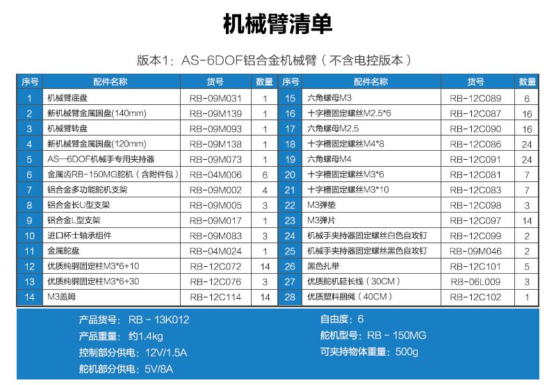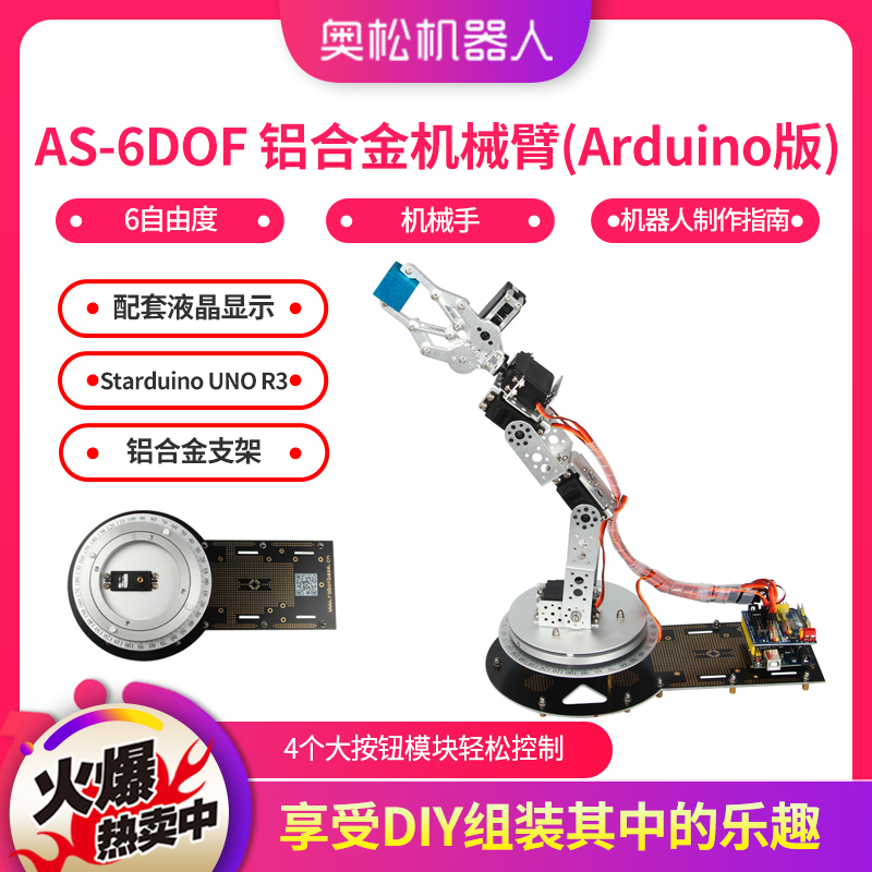 机械手臂是目前在机械人技术领域中得到广泛实际应用的自动化机械装置,在工业制造、医学治疗、娱乐服务、教学应用、军事以及太空探索等领域都能见到它的身影。虽然大家经常在电影或者电视中见过,似曾想拥有一台属于自己的机械臂,但因其功能针对性强和高额的售价,使我们望而却步。现在你不必担心这个问题了,AS-6D0F铝合金机械臂套件,可以实现你的机器人梦想。