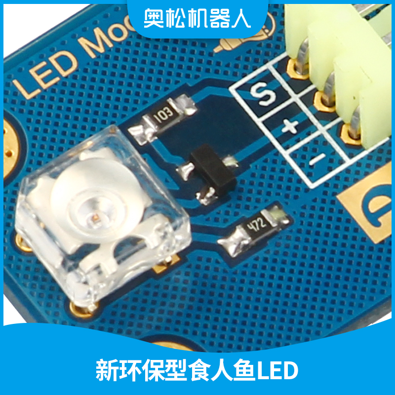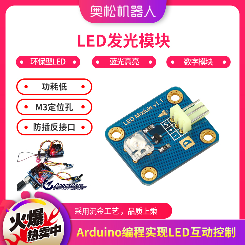 随着近年来LED原材料市场的迅猛发展,各种各样的LED走进我们的生活,尤其彩色LED显示屏的飞速发展,让LED应用市场进入新世纪,LED控制系统的市场也变的更加广阔。为了让电子爱好者与时俱进,新推出的 LED发光模块是 你学习控制LED的入门用品,模块采用市面新环保型食人鱼LED,与传统LED相比,不仅体积小、功耗低(3.3V时,电流20mA)、使用寿命 长、而且亮度高、发光角度大。正是优于这些众多优点,使其刚刚诞生后立刻引起大家关注、其发展趋势像食人鱼一样凶猛故得此名。模块通过3P传感器连接线与传感器扩展板相连,方便快捷,经过控制器编程后,即可轻松实现LED互动控制。