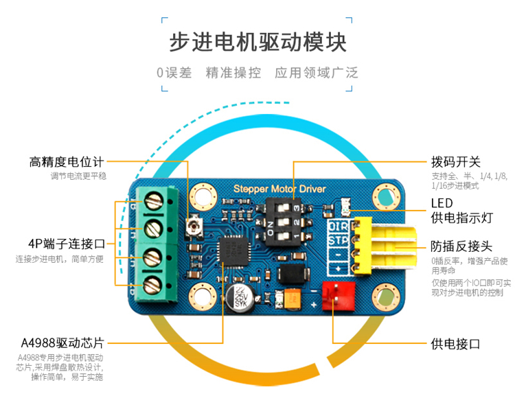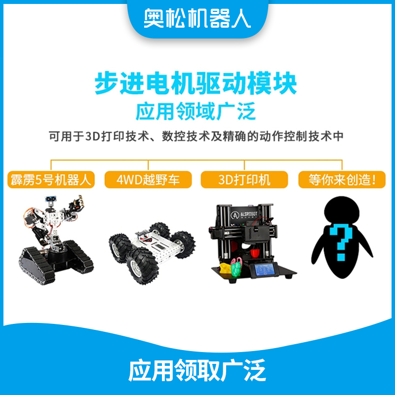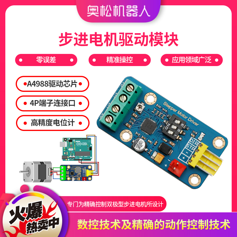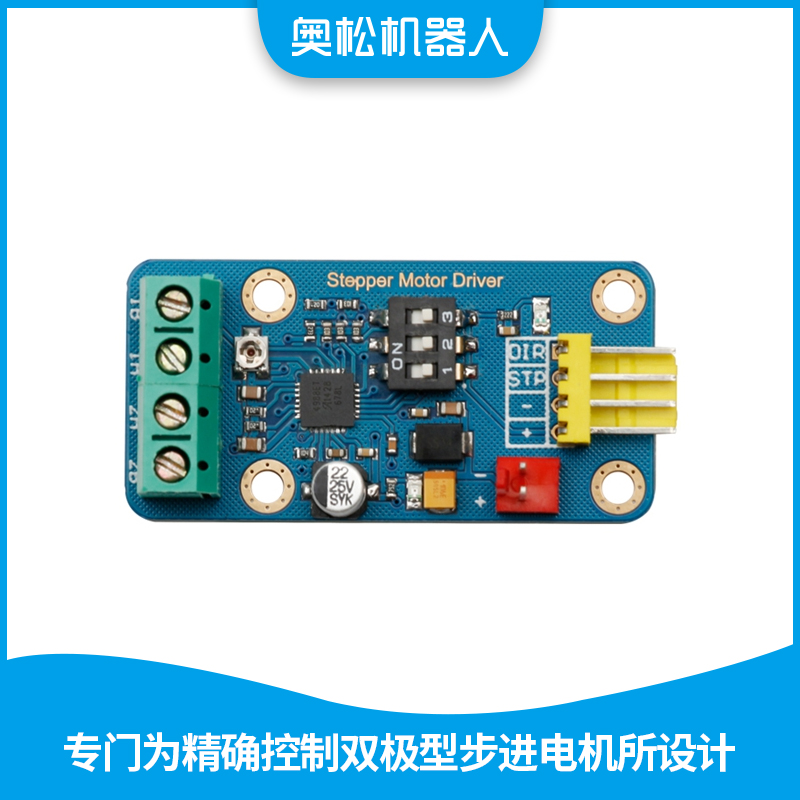 此款奥松机器人出品的步进电机驱动模块专门为精确控制双极型步进电机所设计。当脉冲信号输入给步进电机时,步进电机会一步一步旋转。每接收到一个脉冲信号,步进电机会旋转固定的角度。该模块具有可调节的驱动电流和微步进硬件调节器。可用于3D打印技术、数控技术及精确的动作控制技术。