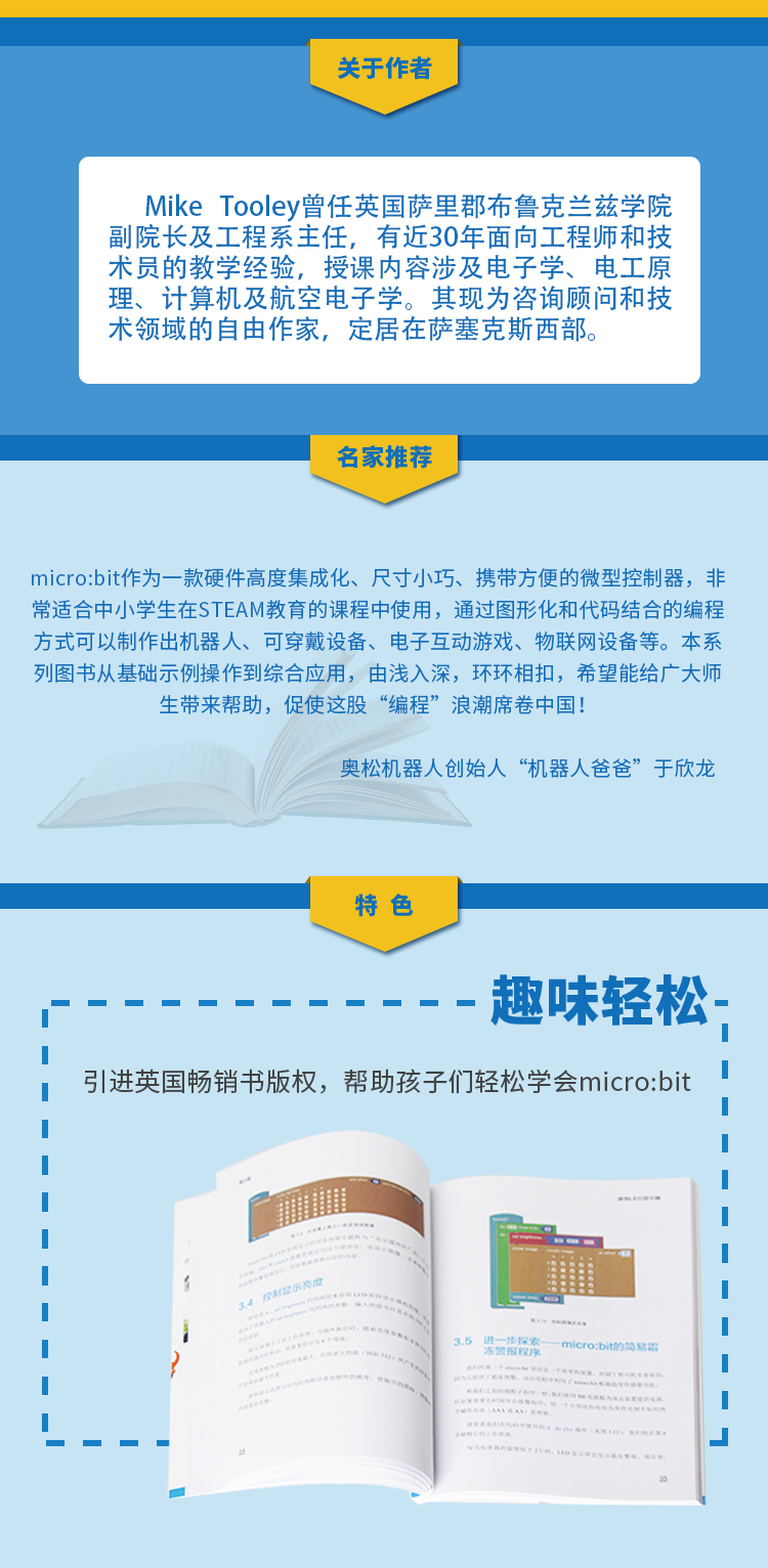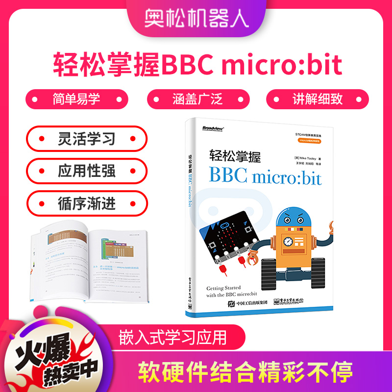 micro:bit作为一款硬件高度集成化、尺寸小巧、携带方便的微型控制器,非常适合中小学生在STEAM教育的课程中使用,通过图形化和代码结合的编程方式可以制作出机器人、可穿戴设备、电子互动游戏、物联网设备等。本系列图书从基础示例操作到综合应用,由浅入深,环环相扣,希望能给广大师生带来帮助,促使这股“编程”浪潮席卷中国!