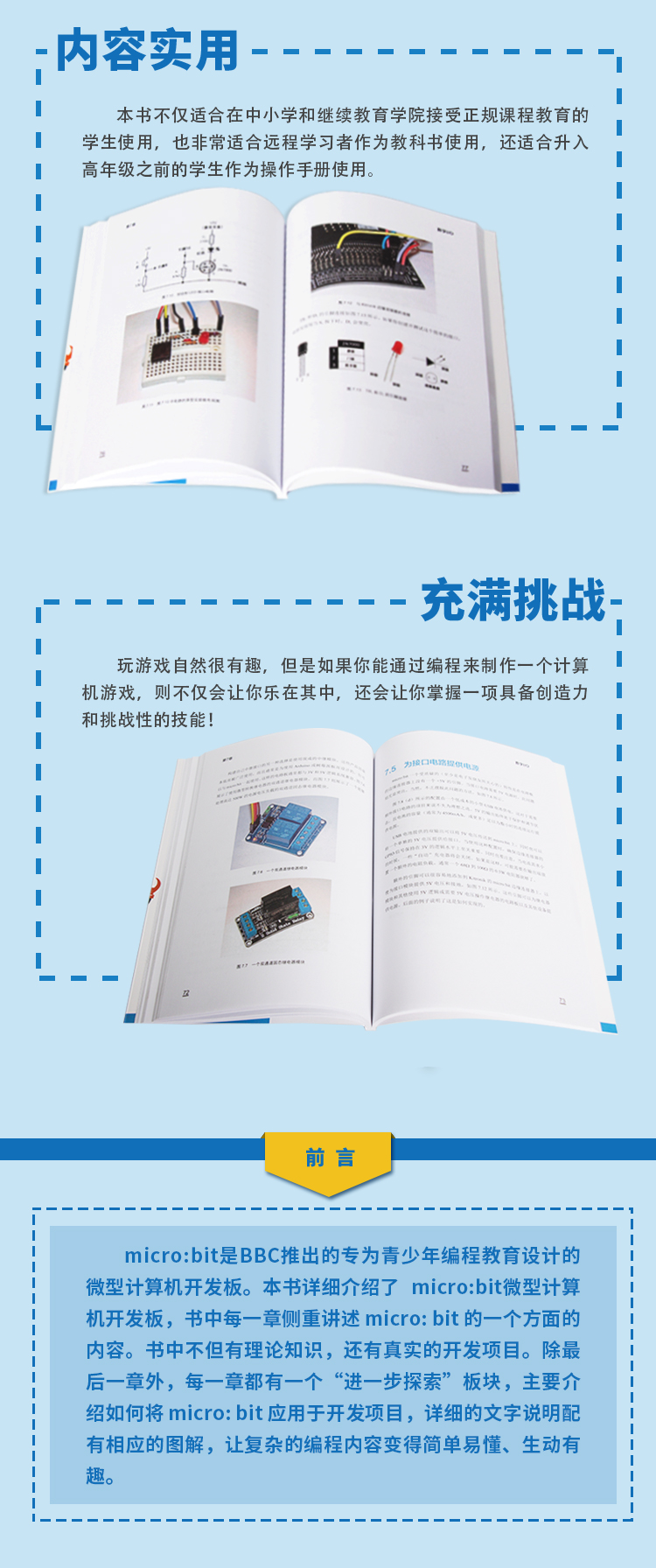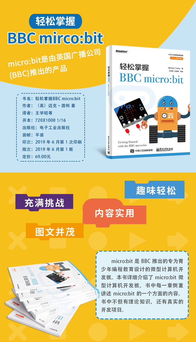 micro:bit是BBC推出的专为青少年编程教育设计的微型计算机开发板。本书详细介绍了micro:bit微型计算机开发板,书中每一章侧重讲述micro:bit的一个方面的内容。书中不但有理论知识,还有真实的开发项目。