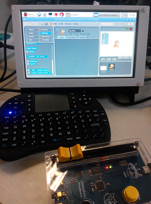 - 将Picoboard传感器扩展板接入树莓派控制器的USB接口