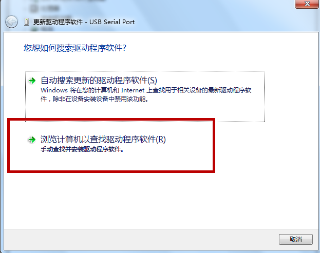 - 单击后弹出如下对话框,选择浏览计算机查找驱动程序软件