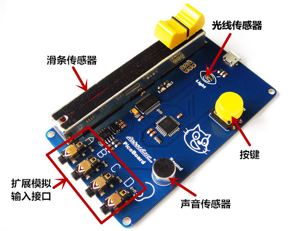 - Micro USB 接口:Picoboard 传感器扩展板与电脑连接进行互动设计、调试接口,也是 Picoboard 传感器扩展板的供电接口。