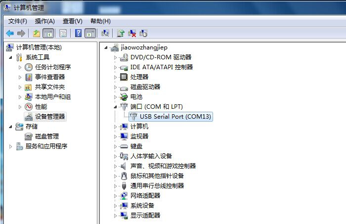 - 驱动程序安装之后,设备管理器中即可显示Picoboard的COM接口,如图所示为com13(根据电脑的不同,显示com接口号也不同)