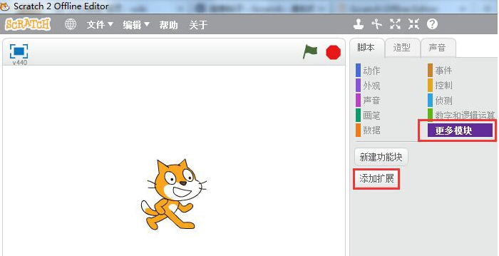- 打开Scratch2.0,左键单击“更多模块”,然后点击“添加扩展