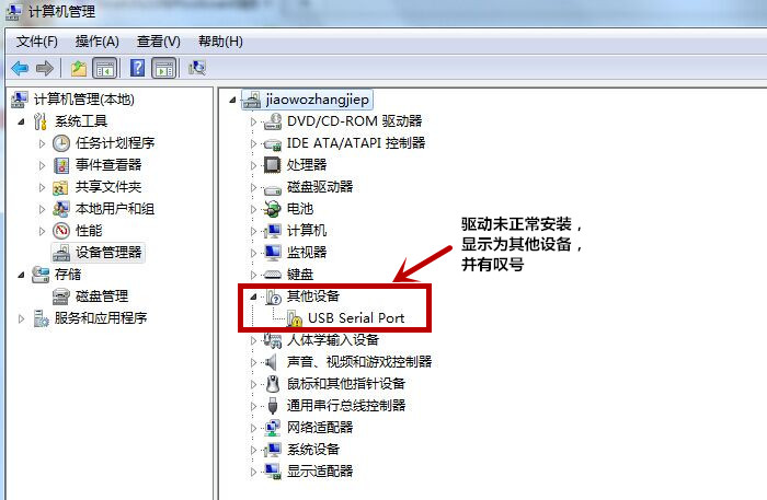 - 右键单击计算机——管理——设备管理器,在其他设备中可以看到已插入的Picoboard传感器扩展板驱动未安装成功,如图所示: