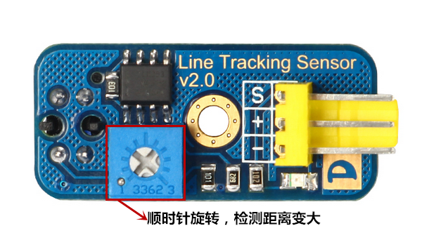 3. 调节寻线传感器的电位计,到适合的距离,将寻线模块的红外探头对准黑线,此时指示灯灭,D13接口LED灭,相应输出端(S)输出TTL低电平;