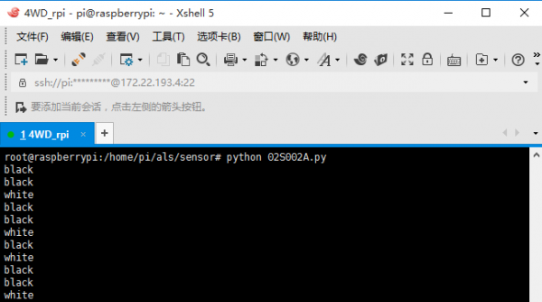 使用 Xshell 登陆到树莓派控制器,当传感器检测到黑色线时,在终端打印 black,当时白线时,打印 white。
